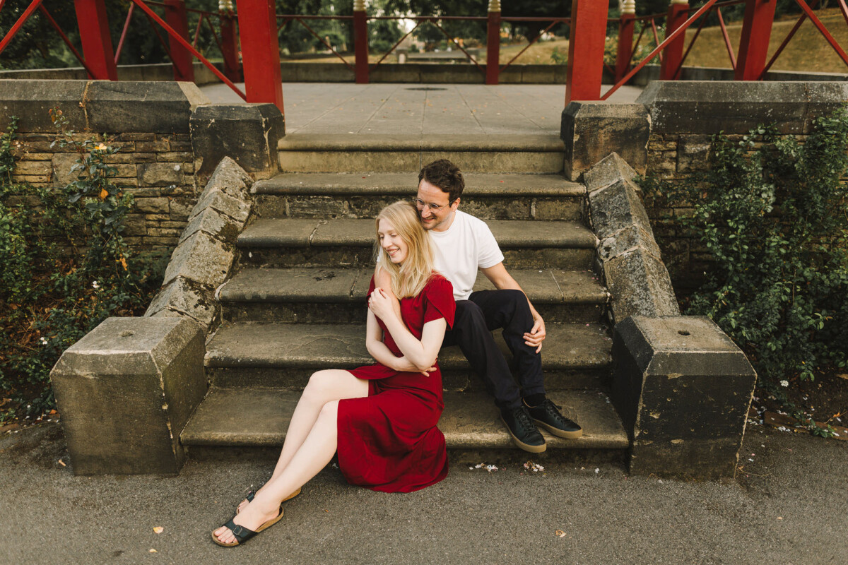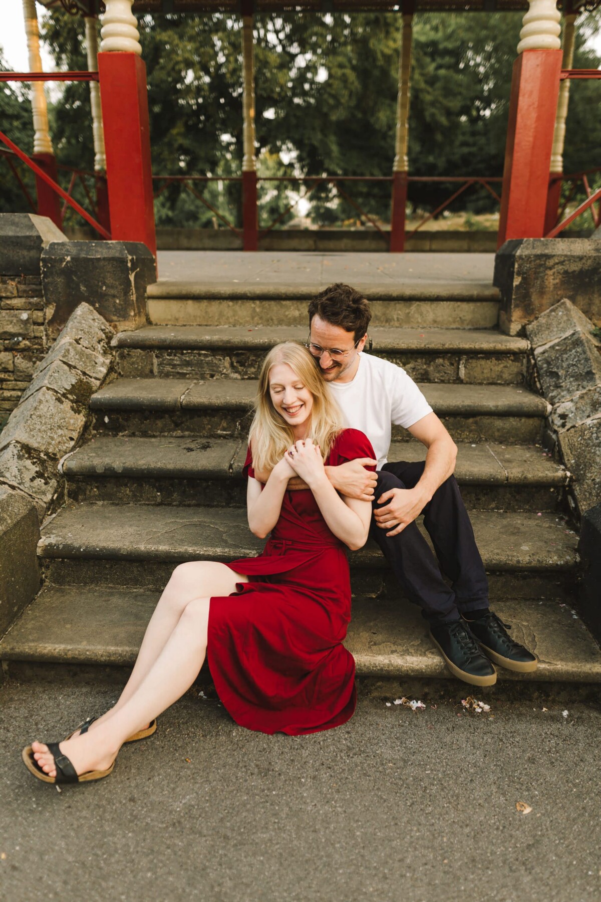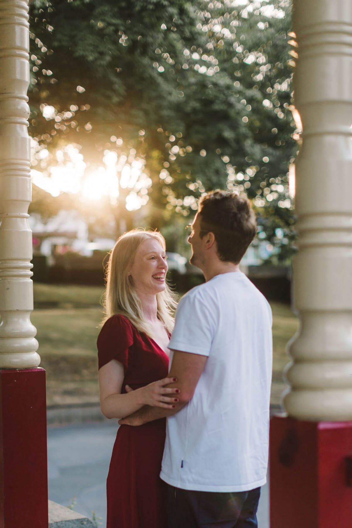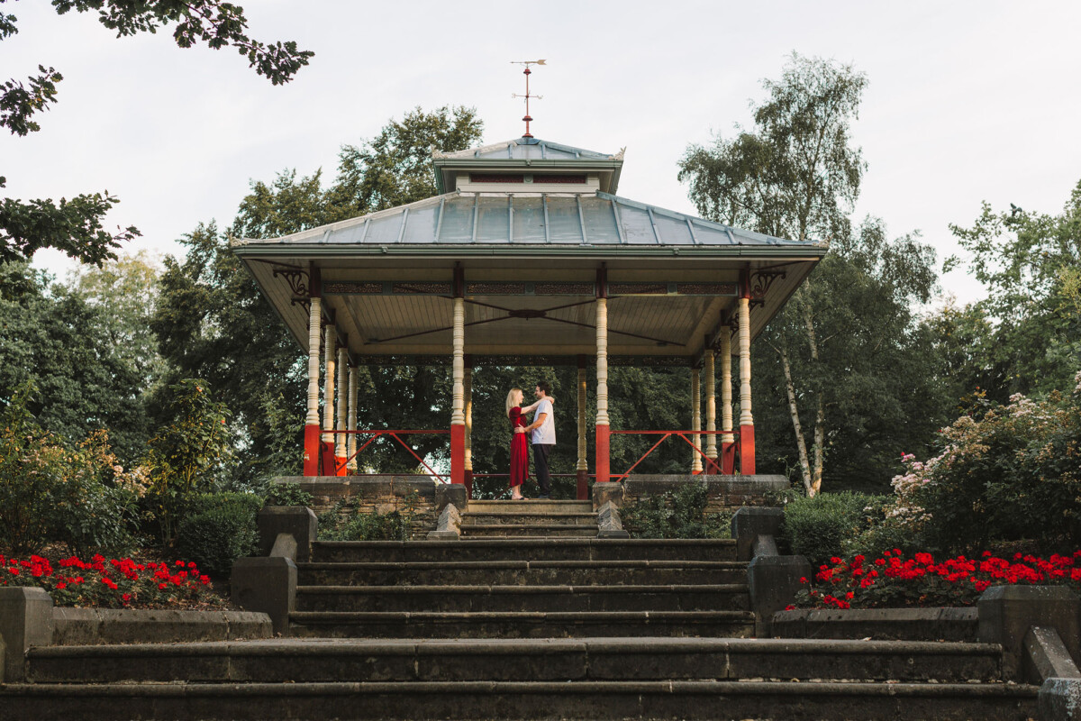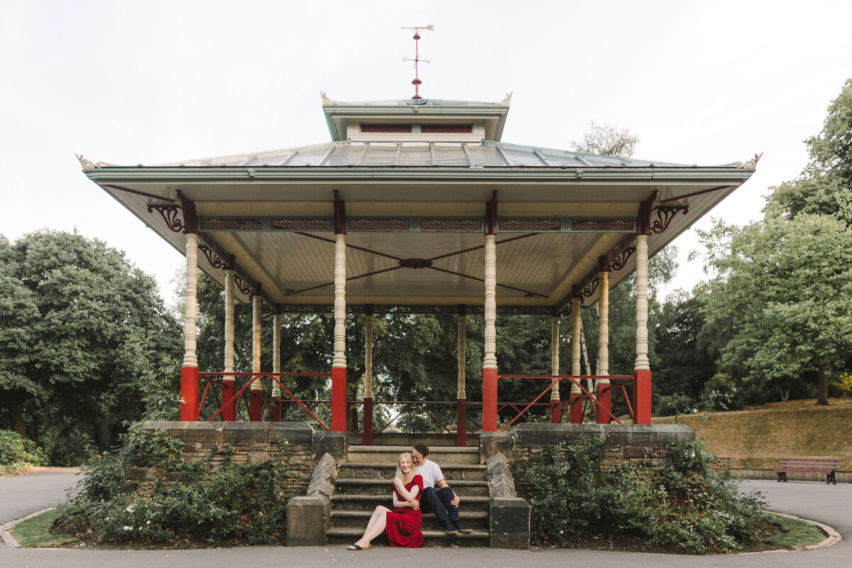 Sarah had sourced a dress the exact same colour as the red on the bandstand. I LOVE this colour and also LOVE how much it made the photos pop – they look so good I just couldn’t not share them! There are similar colours at their wedding venue and I honestly cannot wait for their wedding day to come!