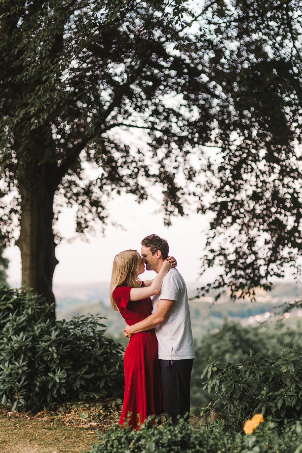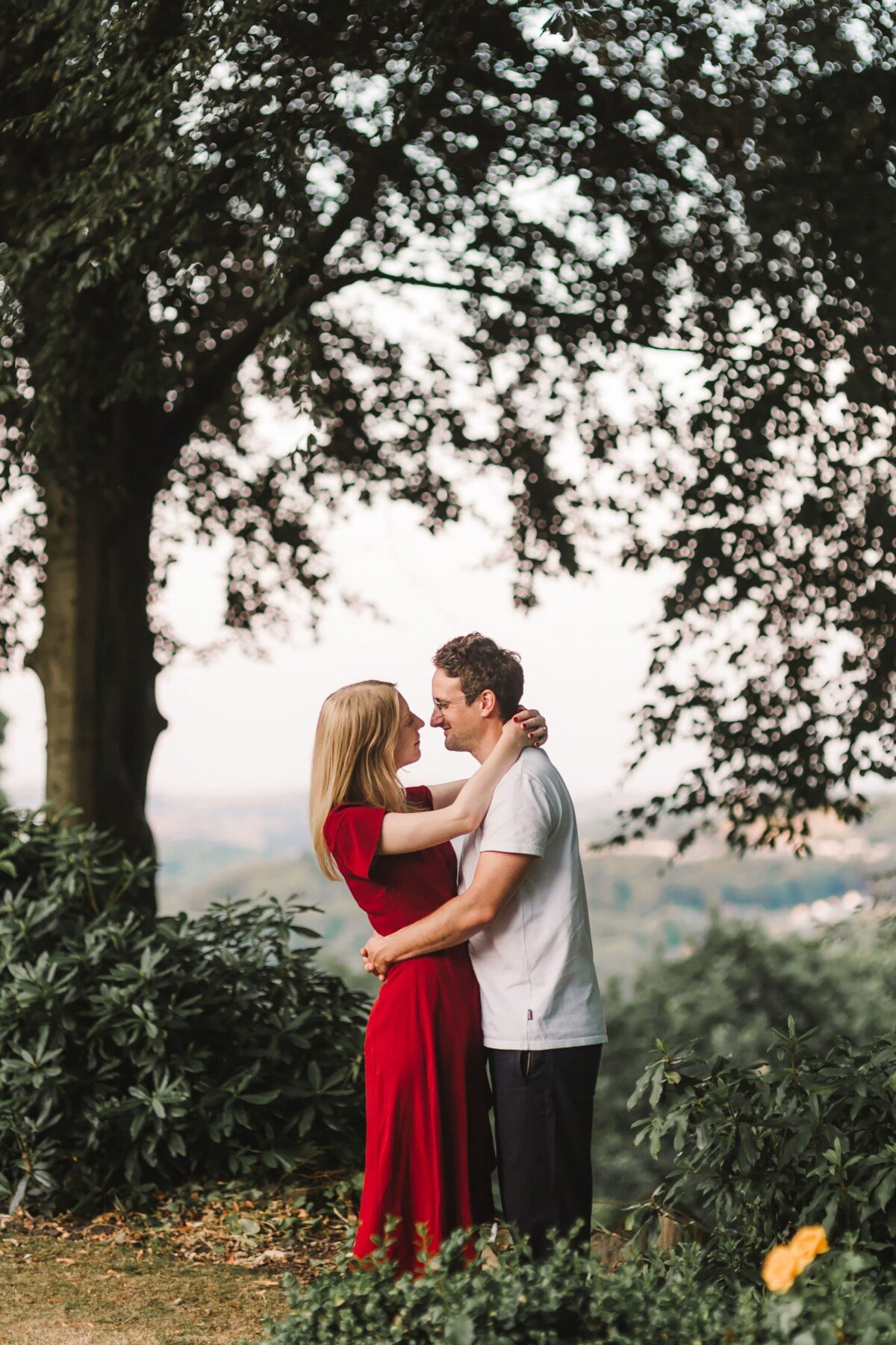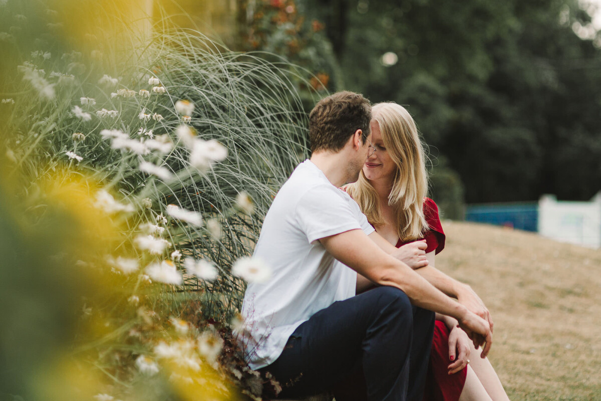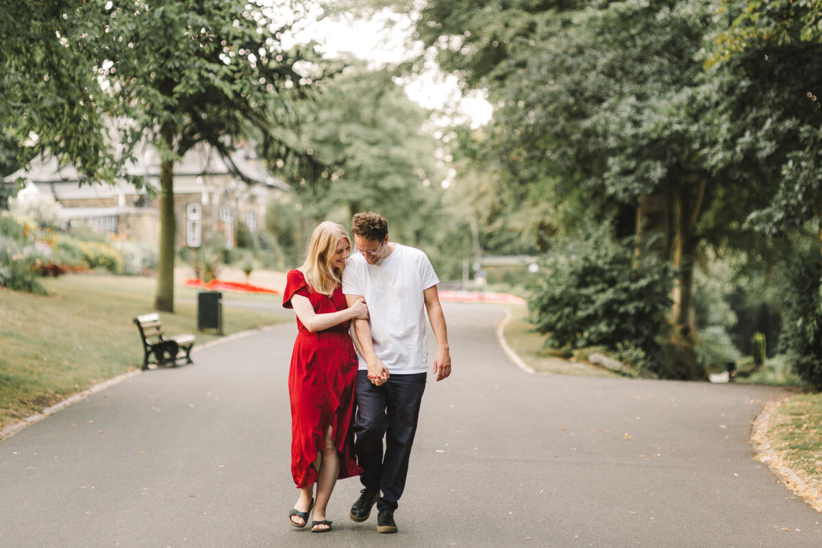 We started our Beaumont Park Huddersfield engagement shoot in the bandstand and then walked along the main path of the park. I tried out lots of my simple posing techniques with them – which really only involve a teeny bit of direction and a few silly games. It’s just about finding ways that you feel comfortable when standing close together (probably closer than you would normally stand!). We ended our shoot with a few photos in front of the railway bridge. The park is particularly special to them because Paul’s relative once lived in the park’s lodges and worked in the park, so it was wonderful to capture some memories for them here. They were an absolute joy to spend a summer evening with and I’m so glad they like the photographs as much as I do.