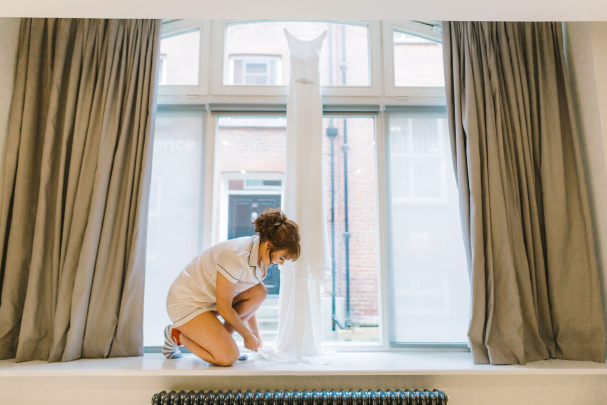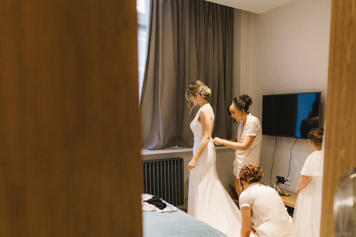 Olwen hired one of the Mansio Apartments to get ready in – there was a bedroom as well as a kitchen diner which meant there was plenty of space for everyone. It was lovely to work with Bow & Blush again too and they did a fantastic job with all the hair and make-up. Olwen was so incredibly chilled and the only request she made all morning was to ask her dad to make her a boiled egg! The apartment was on the ground floor, so I was able to get creative and to take some photos through the window from outside.