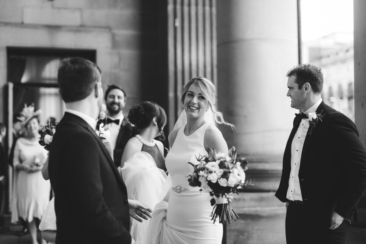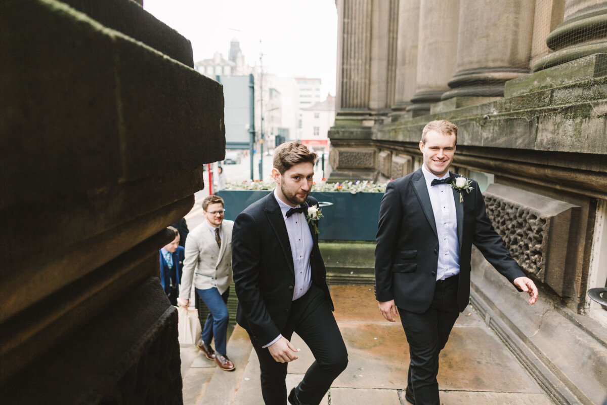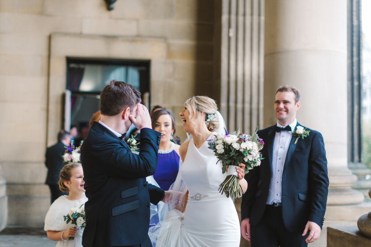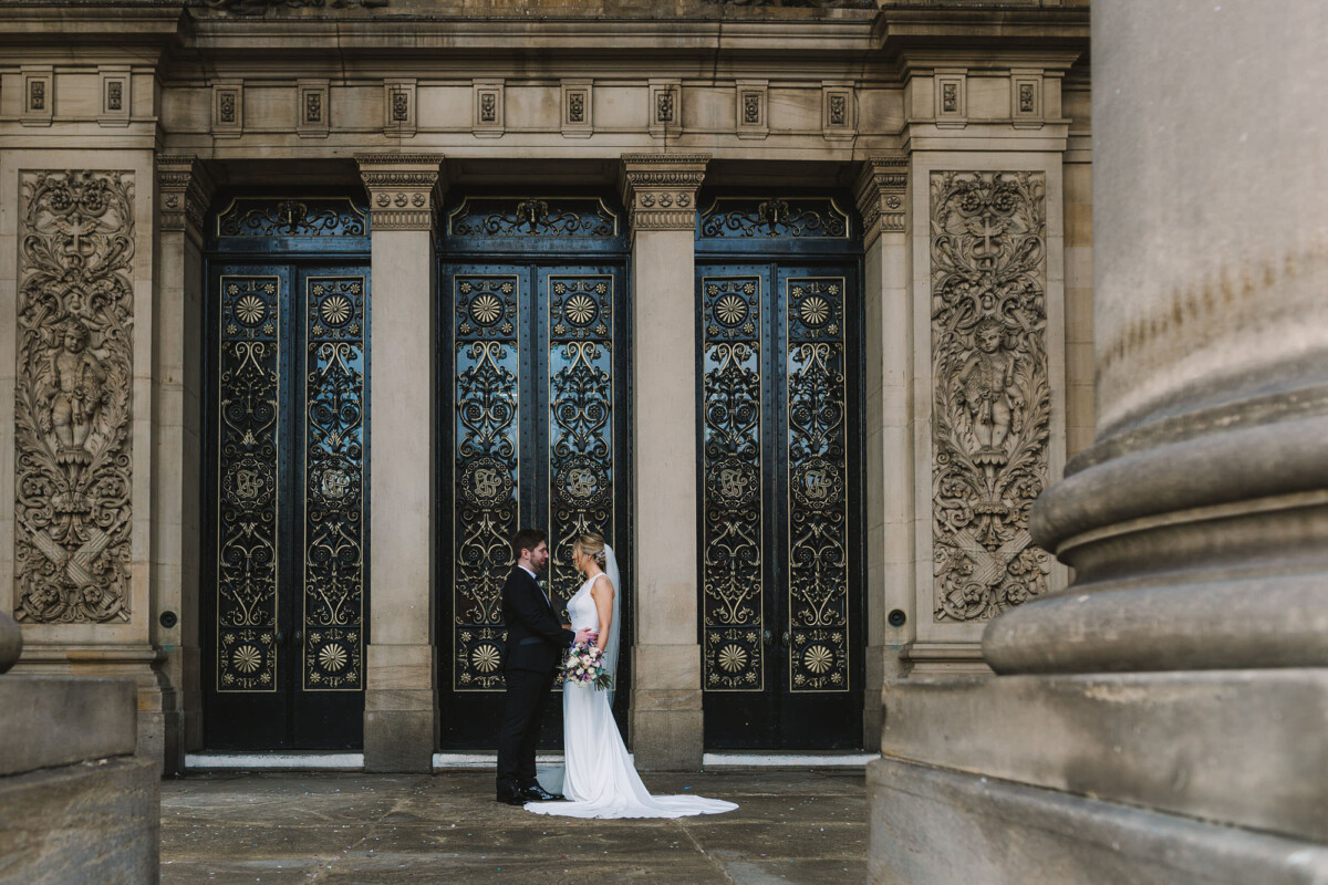 The ceremony took place at Leeds Town Hall, with Daniel arriving by foot after having a pre-wedding tipple at one of the local bars (and who can blame him?). Olwen was a tad early so had to hide until the guests and Daniel had gone through to the ceremony room. The ceremony itself was full of laughs (as you can see from the photos) and at the end we headed straight out to the stairs at the front of Leeds Town Hall. We whizzed through a few group shots and then the guests went ahead to The Iberica whilst Olwen and Daniel had a five-minute breather (and I grabbed some portraits of them).