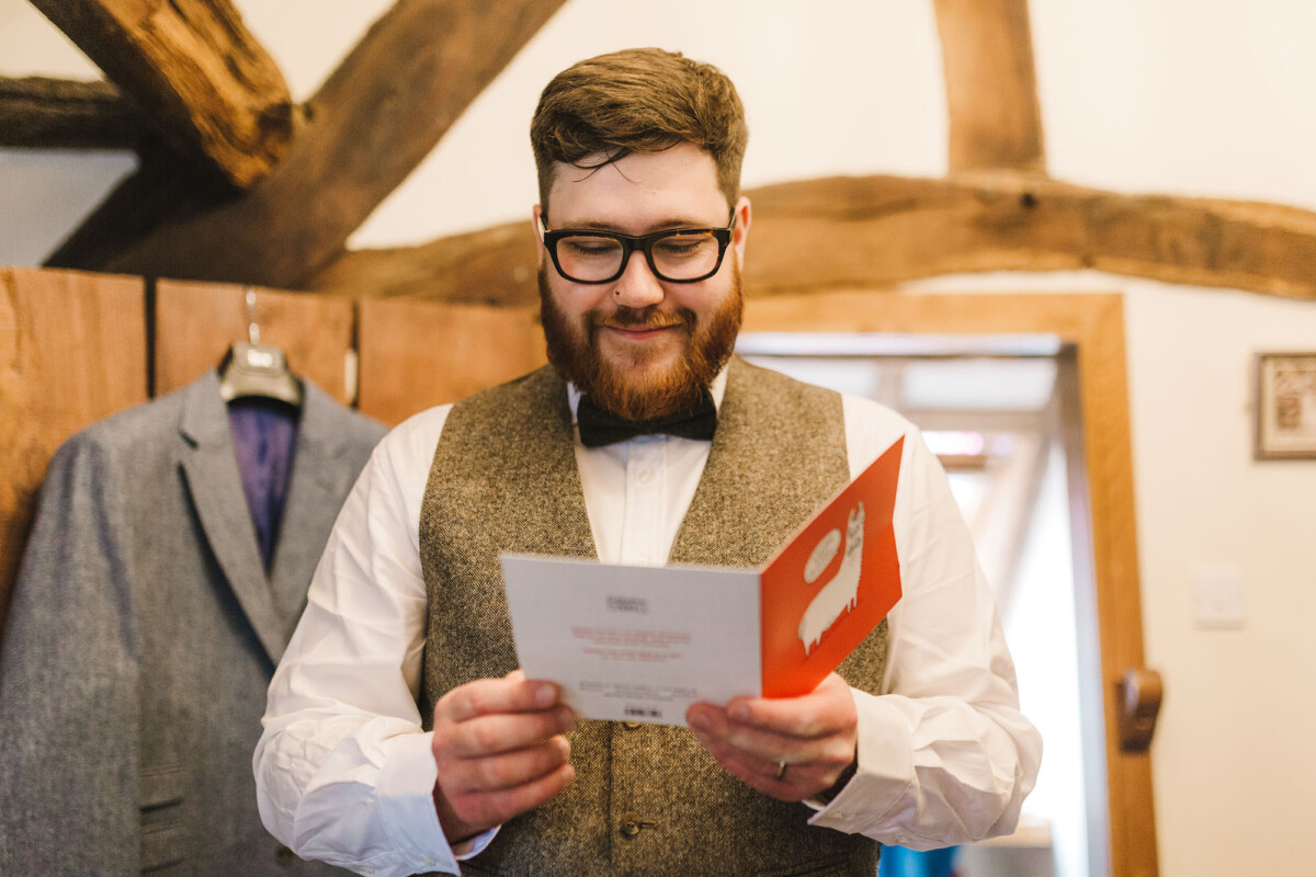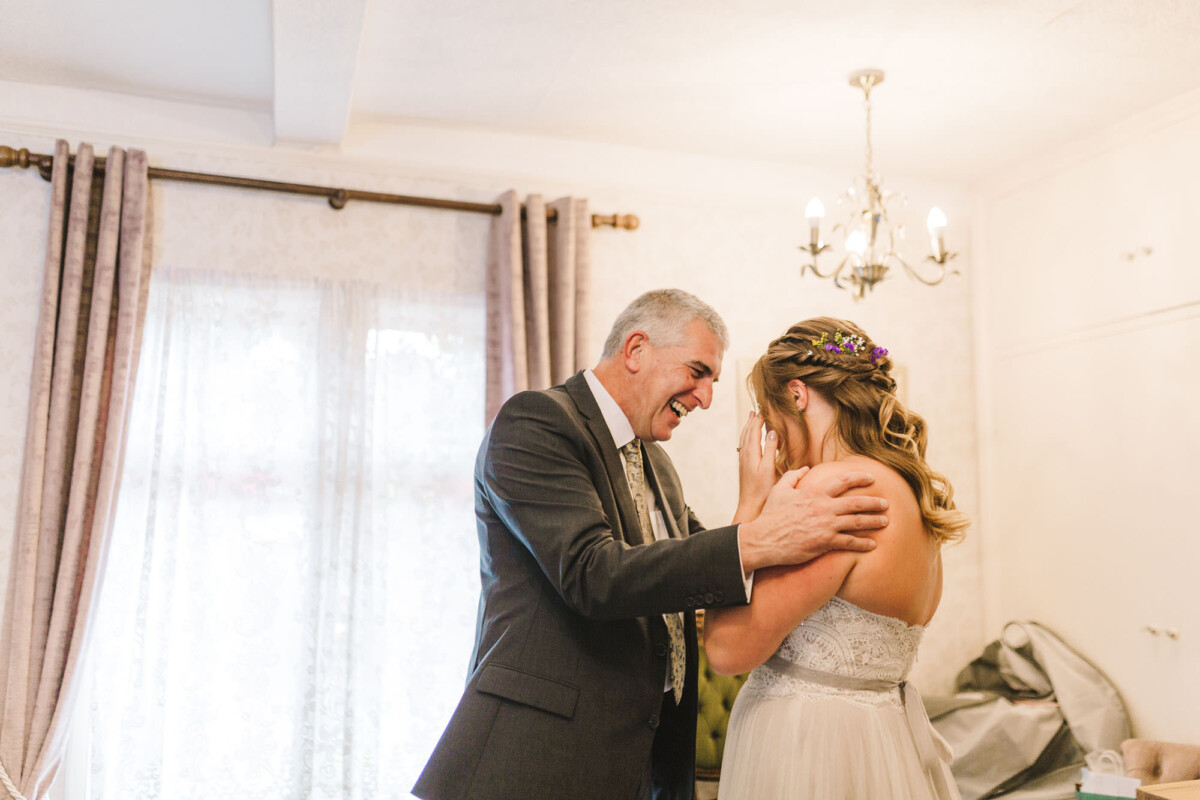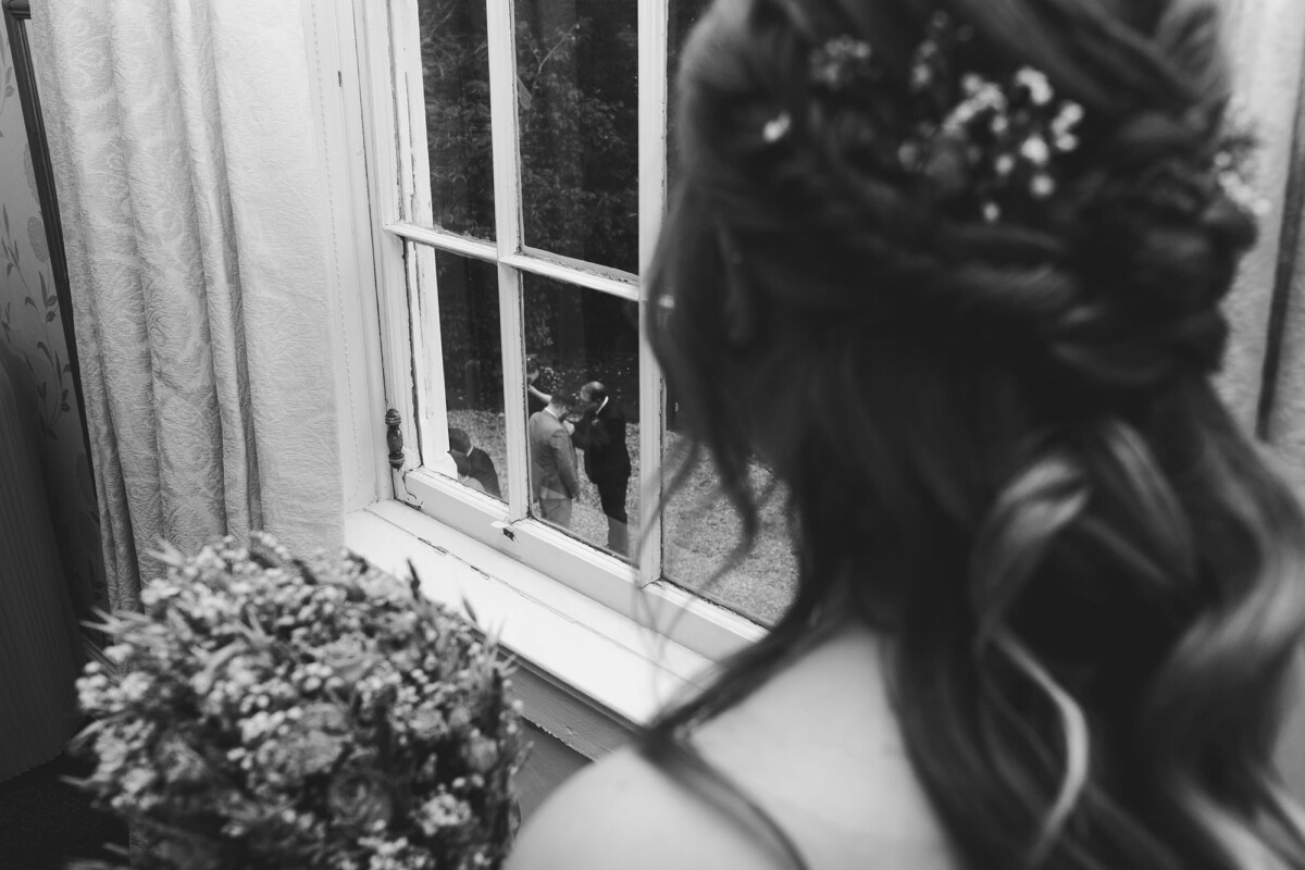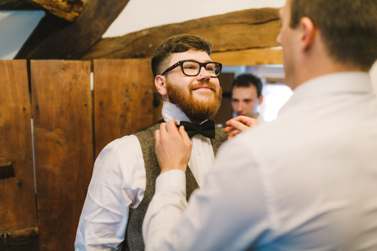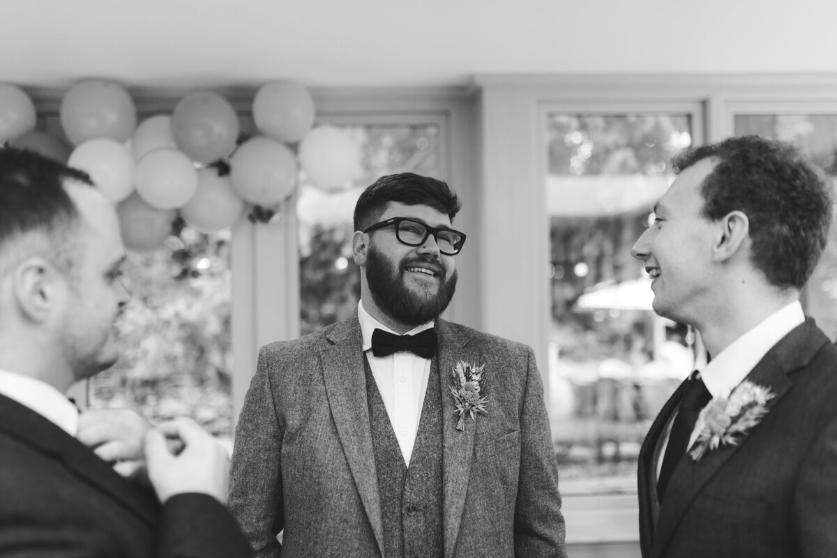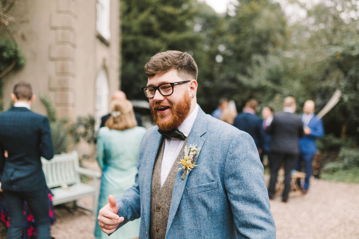 Emily and Tom were both able to get ready at their venue, The Old Rectory House in Redditch. Emily wore a beautiful dress with grey tones and lace. She mentioned how her amazing seamstress (details below) did such a brilliant job of making sure it was a perfect fit. Emily’s friend and bridesmaid did her make-up, which was just so lovely! It was such a chilled morning with plenty of time to chill once everyone was ready. Tom wore a tweed suit and looked very dapper. There was a moment when Emily could see him from an upstairs window and couldn’t stop staring at him.