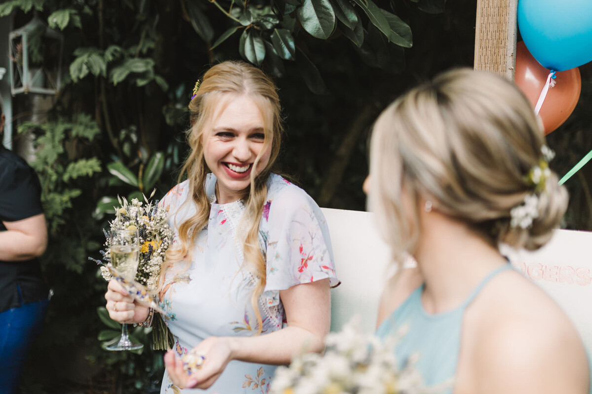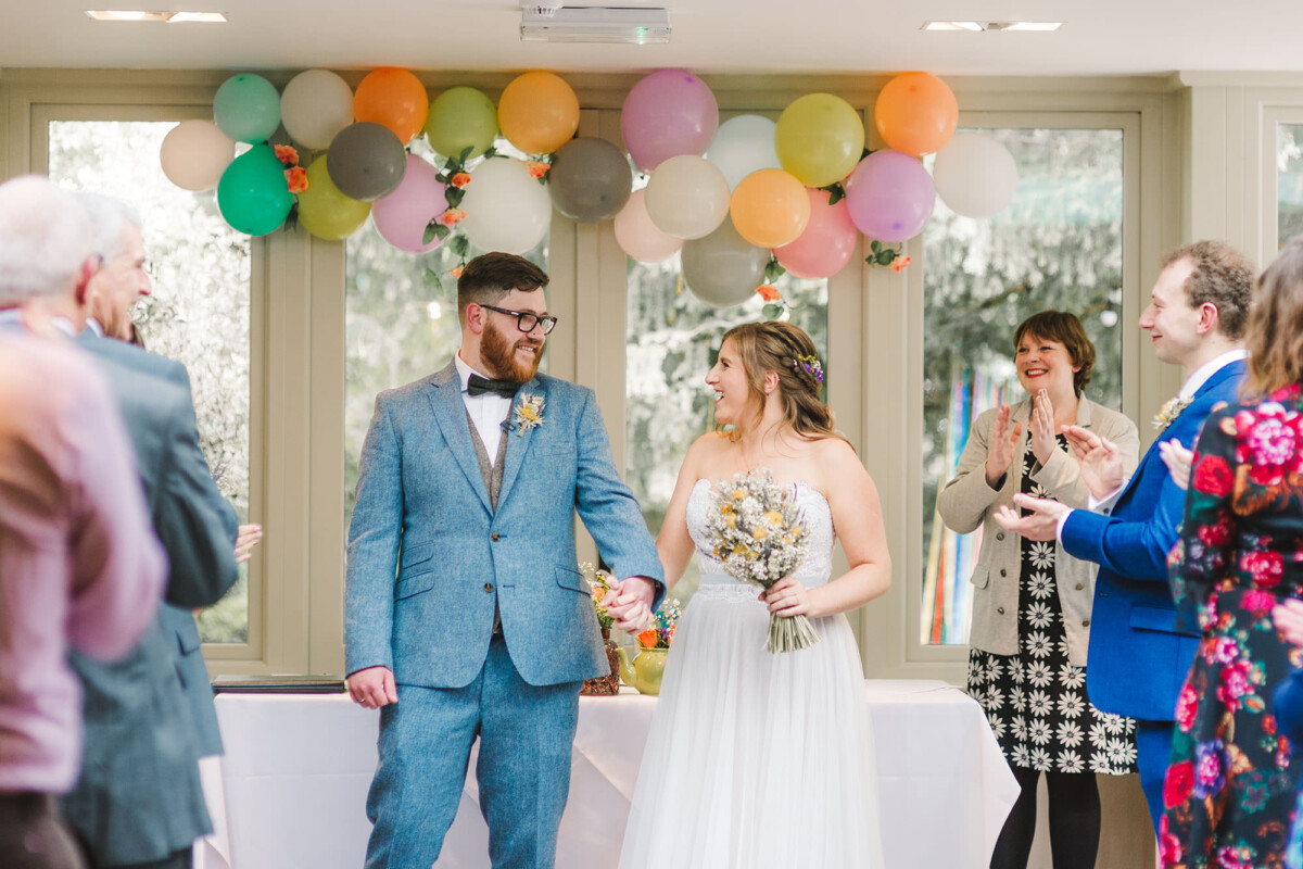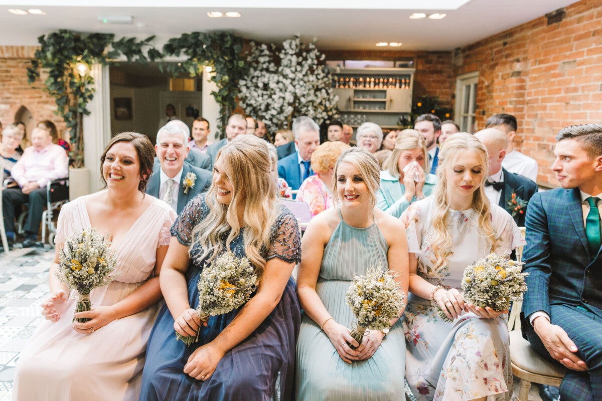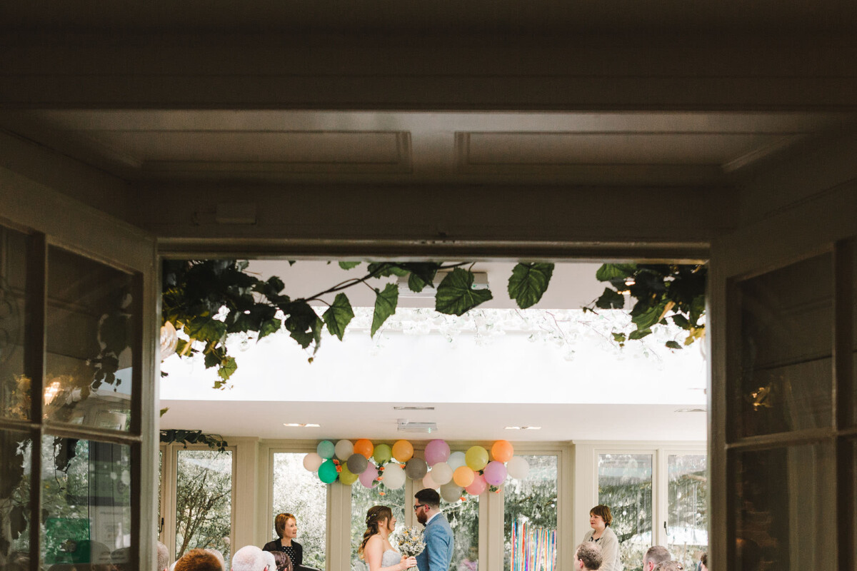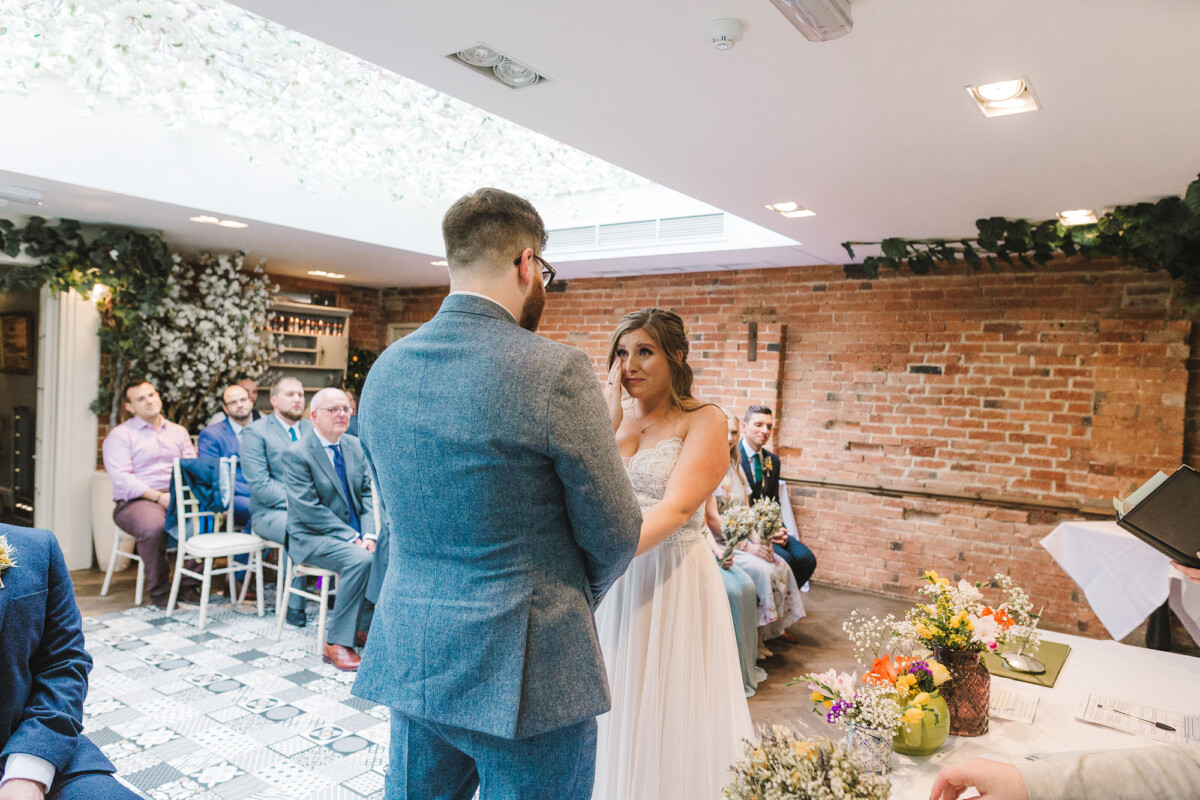 The ceremony took place in the orangery. Outdoor weddings are possible at The Old Rectory House in the summer, but the orangery is just as lovely. It looks out of the garden and the windows let in so much light. Emily had decorated it with bright coloured ribbons, too, which looked amazing. Emily cried down the aisle, and the tears carried on in the ceremony. There were plenty of lols and squeals throughout.