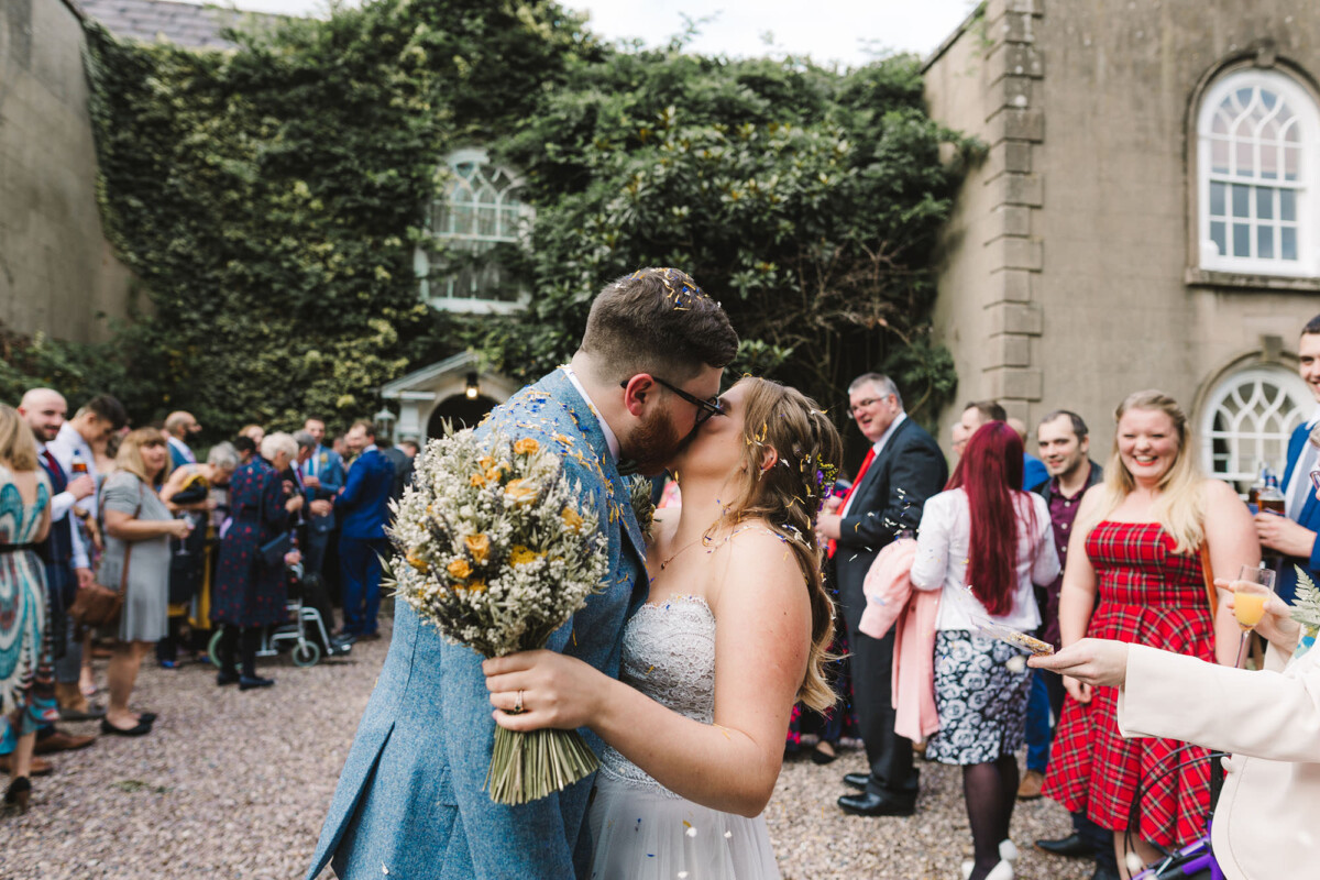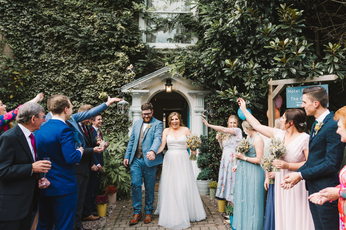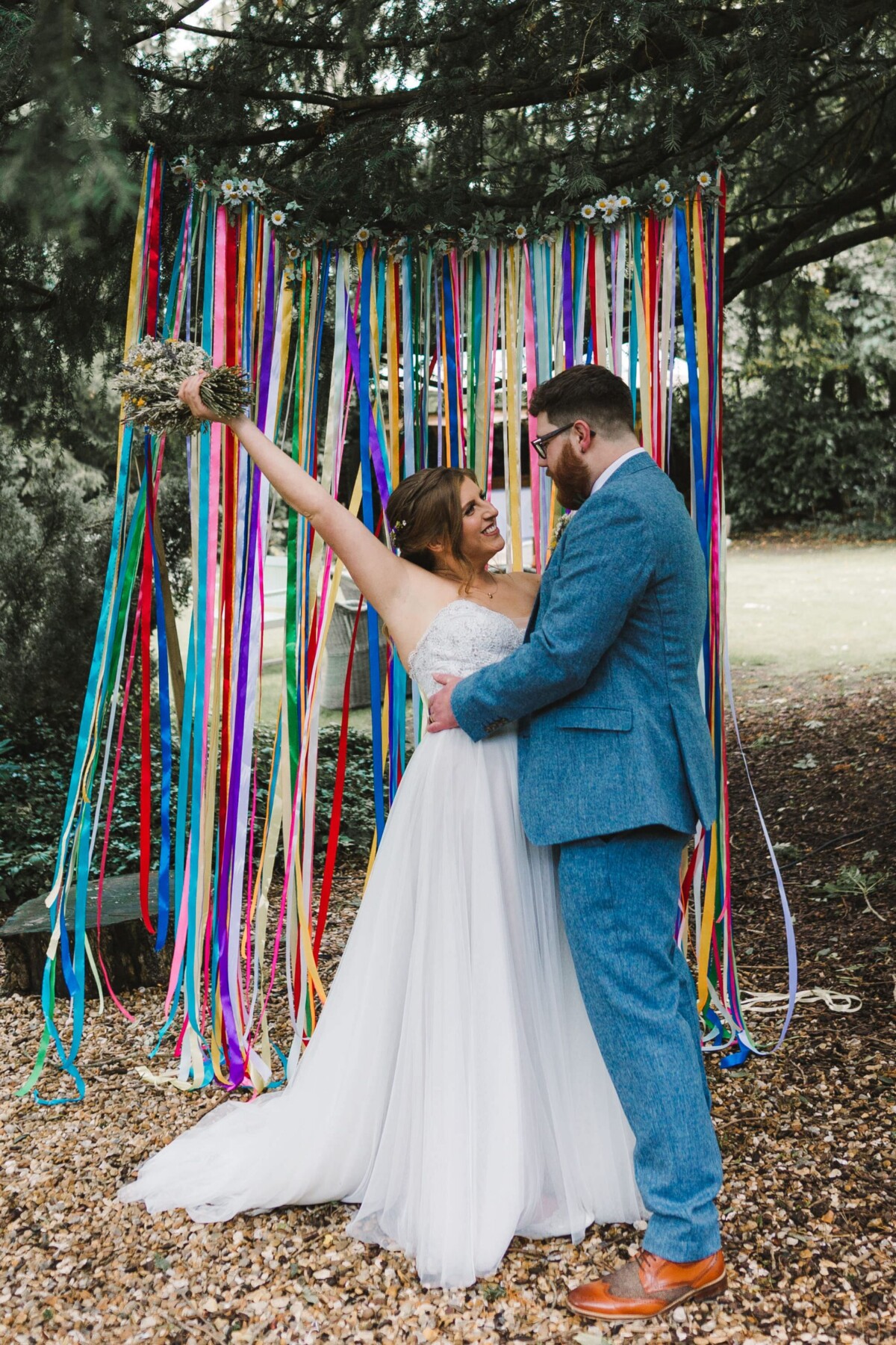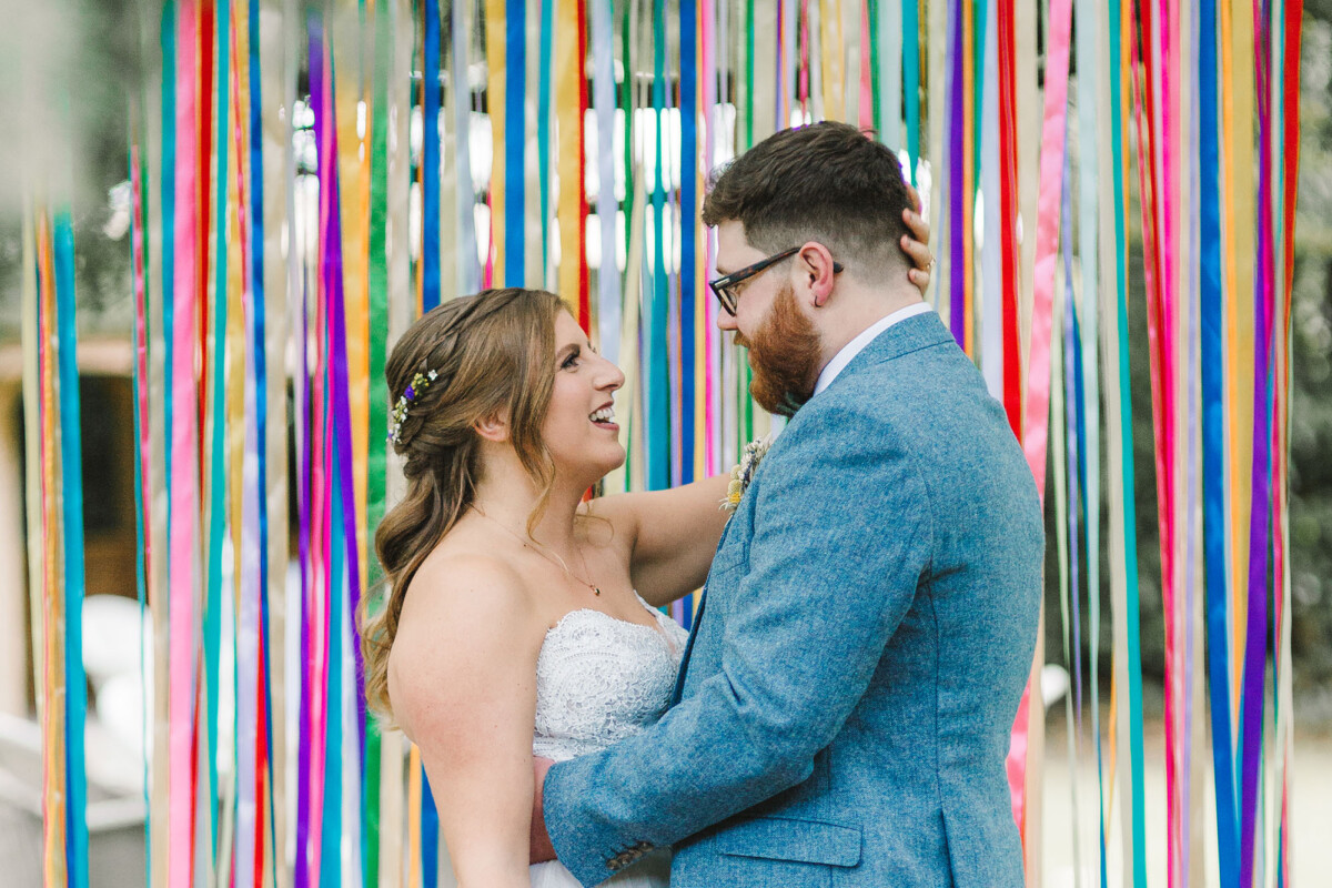 Emily and Tom walked out of their venue straight into a confetti walk, which had some epic ‘straight in the face’ throws from some of the guests (those throws always give the BEST faces). We quickly got through their small group shot list and then headed for a little walk to get a few portraits, after we got some shots in front of the ‘rainbow ribbon washing line’. Tom gave Emily a piggyback into their reception and then they ate yummy sausage and mash.