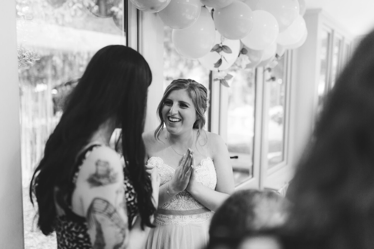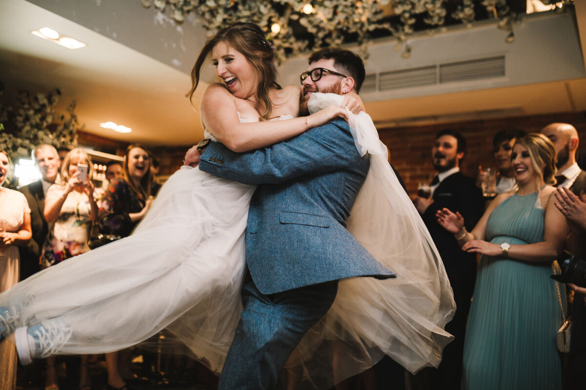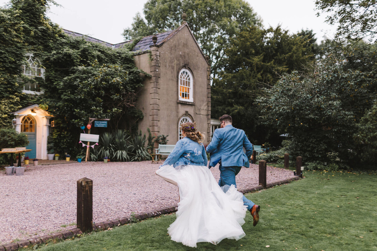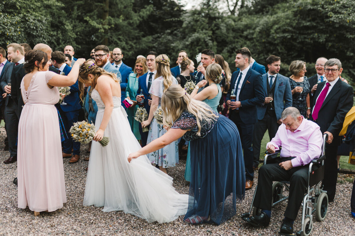Emily and Tom walked out of their venue straight into a confetti walk, which had some epic ‘straight in the face’ throws from some of the guests (those throws always give the BEST faces). We quickly got through their small group shot list and then headed for a little walk to get a few portraits, after we got some shots in front of the ‘rainbow ribbon washing line’. Tom gave Emily a piggyback into their reception and then they ate yummy sausage and mash.